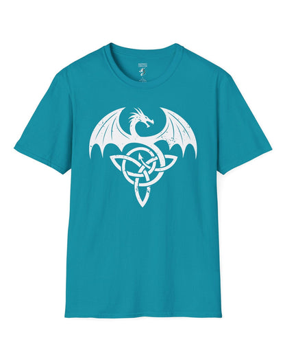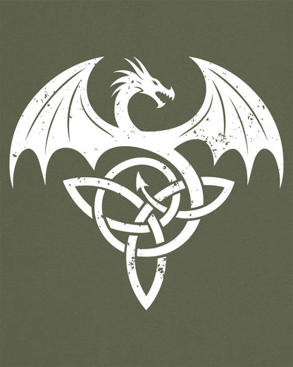 A bold dragon head dominates the top of the image, its eyes narrowed in a powerful gaze. The creature’s tail curves downward in a smooth arc, intricately forming a Celtic knot at the base. Strong lines and sharp symmetry give the composition a sense of both intensity and ancient elegance.